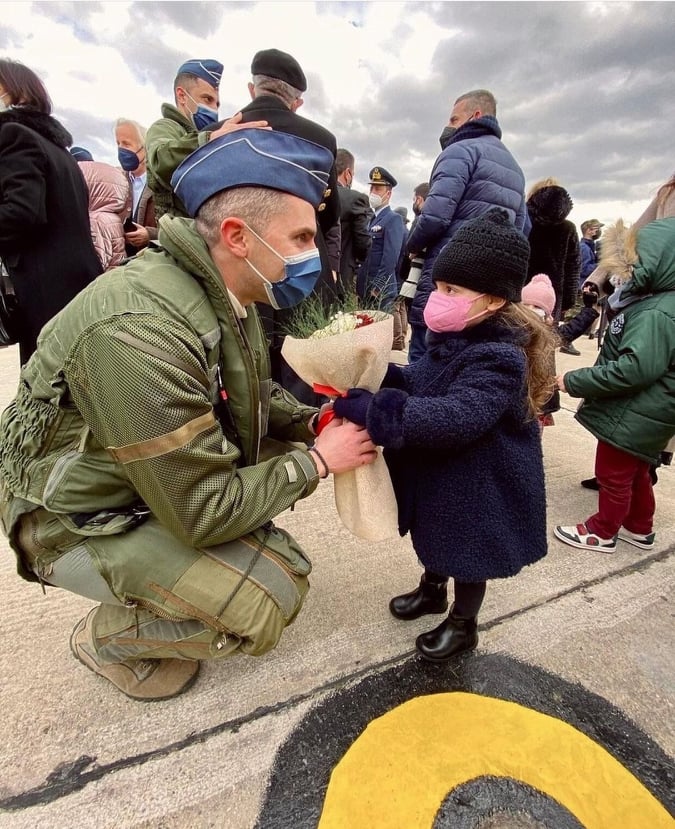 Η μικρούλα περίμενε για πάνω από μια ώρα για να του δώσει μια ανθοδέσμη και αυτή η αναμονή άξιζε καθώς οι περισσότερες οικογένειες των πιλότων μας είχαν να τους δουν από έξι έως οκτώ μήνες αφού ήταν στην Γαλλία για εκπαίδευση.