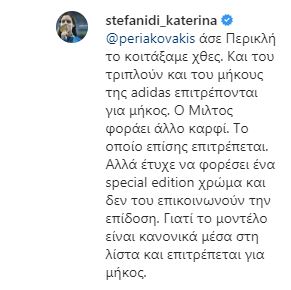 Στεφανίδη: «Άσε Περικλή το κοιτάξαμε χθες. Και του τριπλούν και του μήκους της adidas επιτρέπονται για μήκος. Ο Μιλτος φοράει άλλο καρφί. Το οποίο επίσης επιτρέπεται. Αλλά έτυχε να φορέσει ένα special edition χρώμα και δεν του επικοινωνούν την επίδοση. Γιατί το μοντέλο είναι κανονικά μέσα στη λίστα και επιτρέπεται για μήκος».