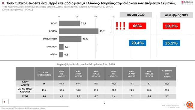 Στο ερώτημα «Πόσο πιθανό θεωρείται ένα θερμό επεισόδιο μεταξύ Ελλάδας-Τουρκίας στη διάρκεια των επόμενων 12 μηνών», οι πολίτες με ποσοστό 66% απαντούν «πολύ» και «αρκετά».