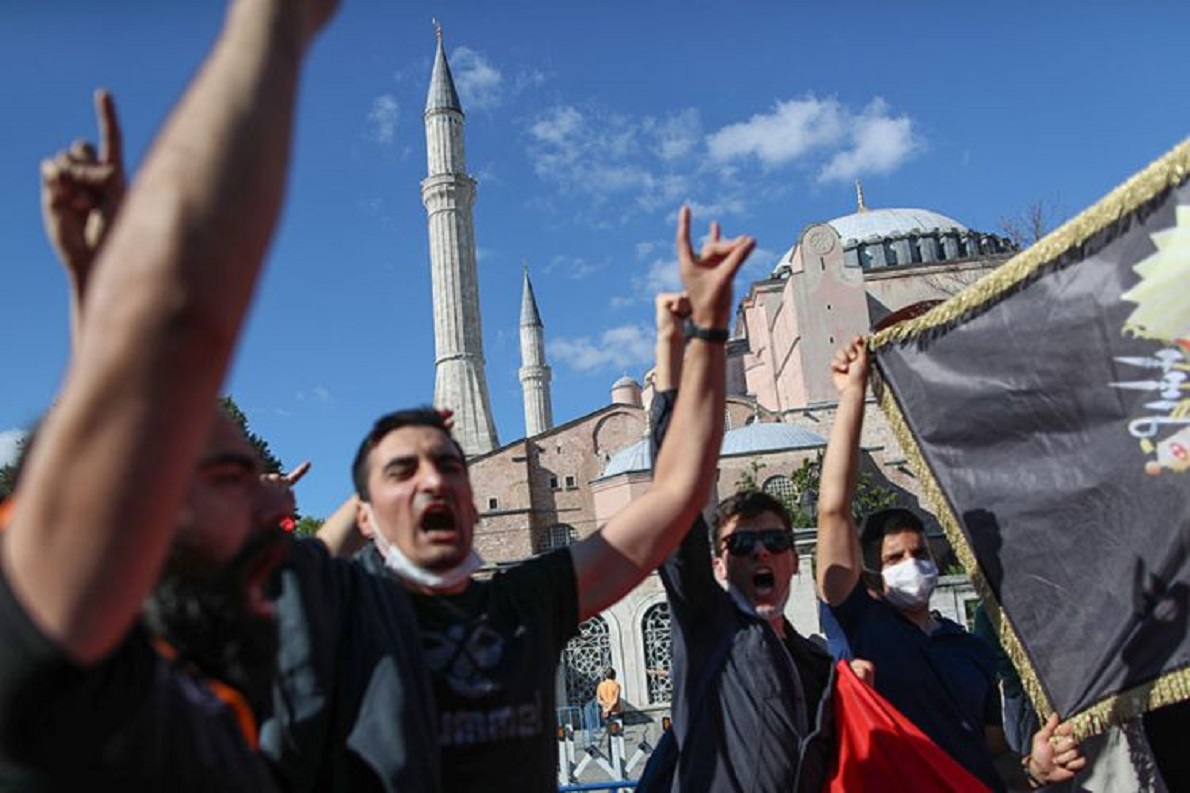 Την ίδια στιγμή Τούρκοι έχουν συγκεντρωθεί έξω από την Αγία Σοφία και φωνάζουν συνθήματα υπέρ του Ρετζέπ Ταγίπ Ερντογάν.